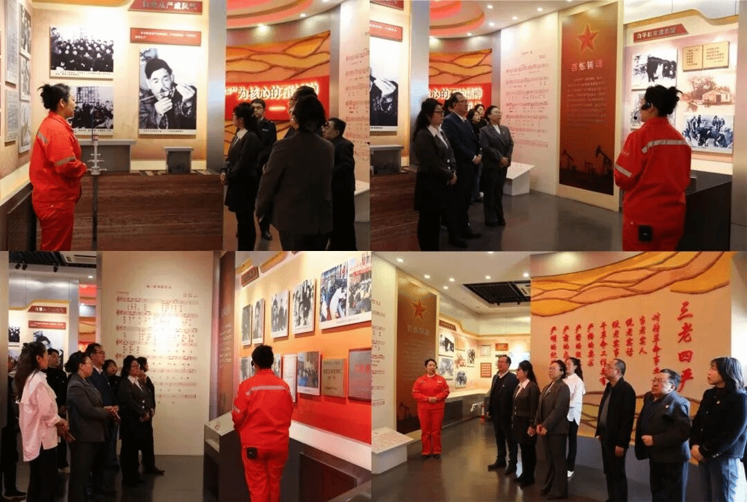 进入展馆内,讲解员详细介绍了中四采油队的历史沿革、发展历程以及独特的企业文化。大家认真聆听,仔细观看展板、实物和影像资料,对中四采油队的起源及文化有了更加深入的了解。