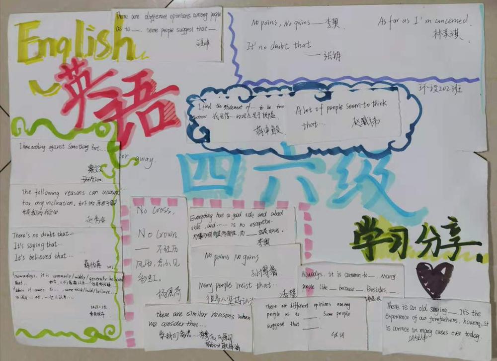 为激发同学们的学习热情,备战四级考试,在四六级经验交流分享会结束后,公司团委发起了征集四级写作句子手抄报活动。同学们踊跃参加,并将这份热情投入到备战英语四级考试的复习中。截至11月22日共征集到来自30班的30个作品。