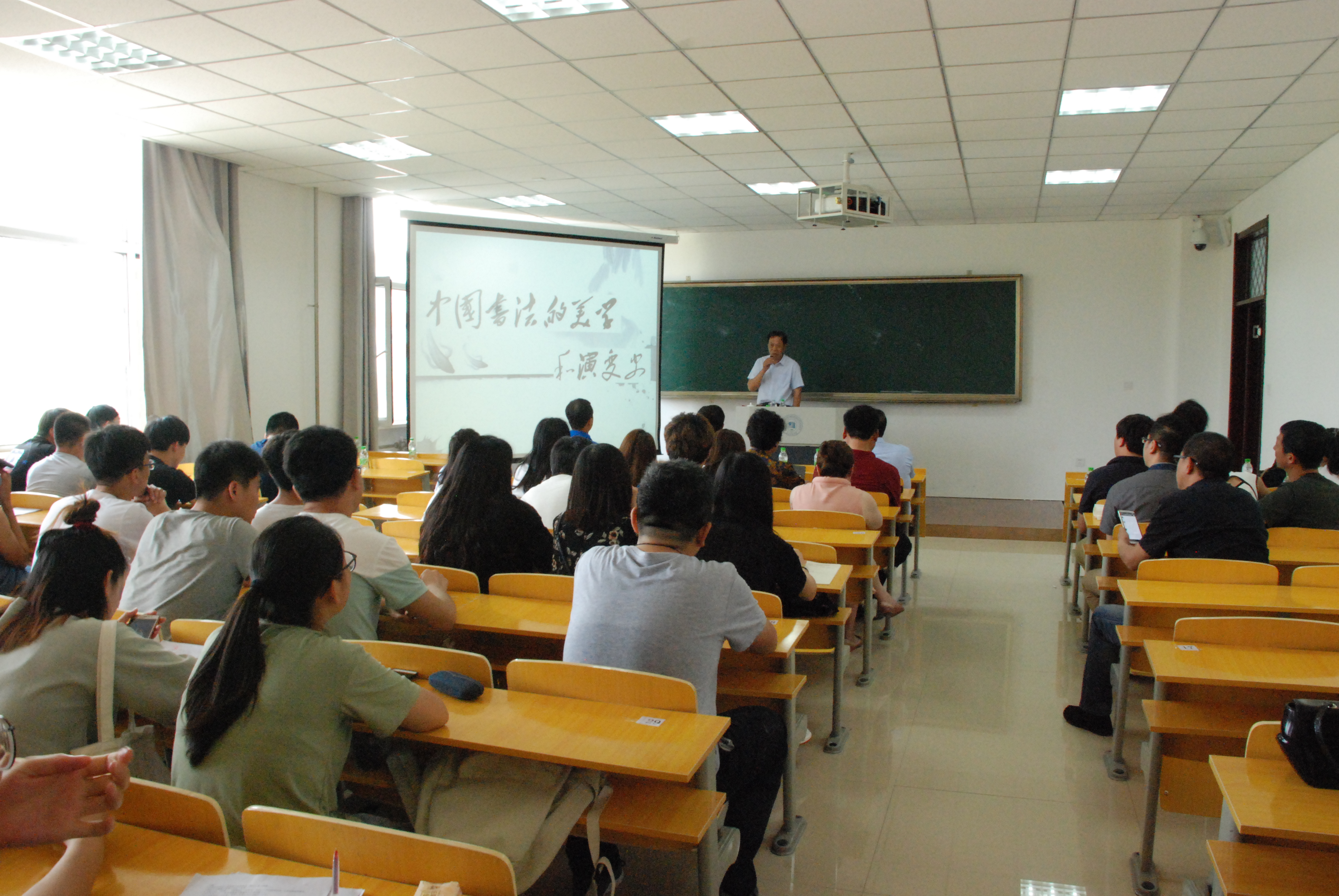 仪式结束后,刘国方教授做了题为《中国书法的美学和演变史》的讲座。他以历史朝代为主线,讲解了从甲骨文到楷书的书法发展演变历史,图文并茂,带领参加讲座的师生领会了历代书法大家作品的风采。刘教授旁征博引用很多书法发展史上经典的典故和有趣的奇闻异事讲解了书法在发展过程中的一些趣事,并对历代大家的作品进行了赏析,对历代的著名书法作品进行了分析,让大家对书法艺术的美学价值有了一定的了解。