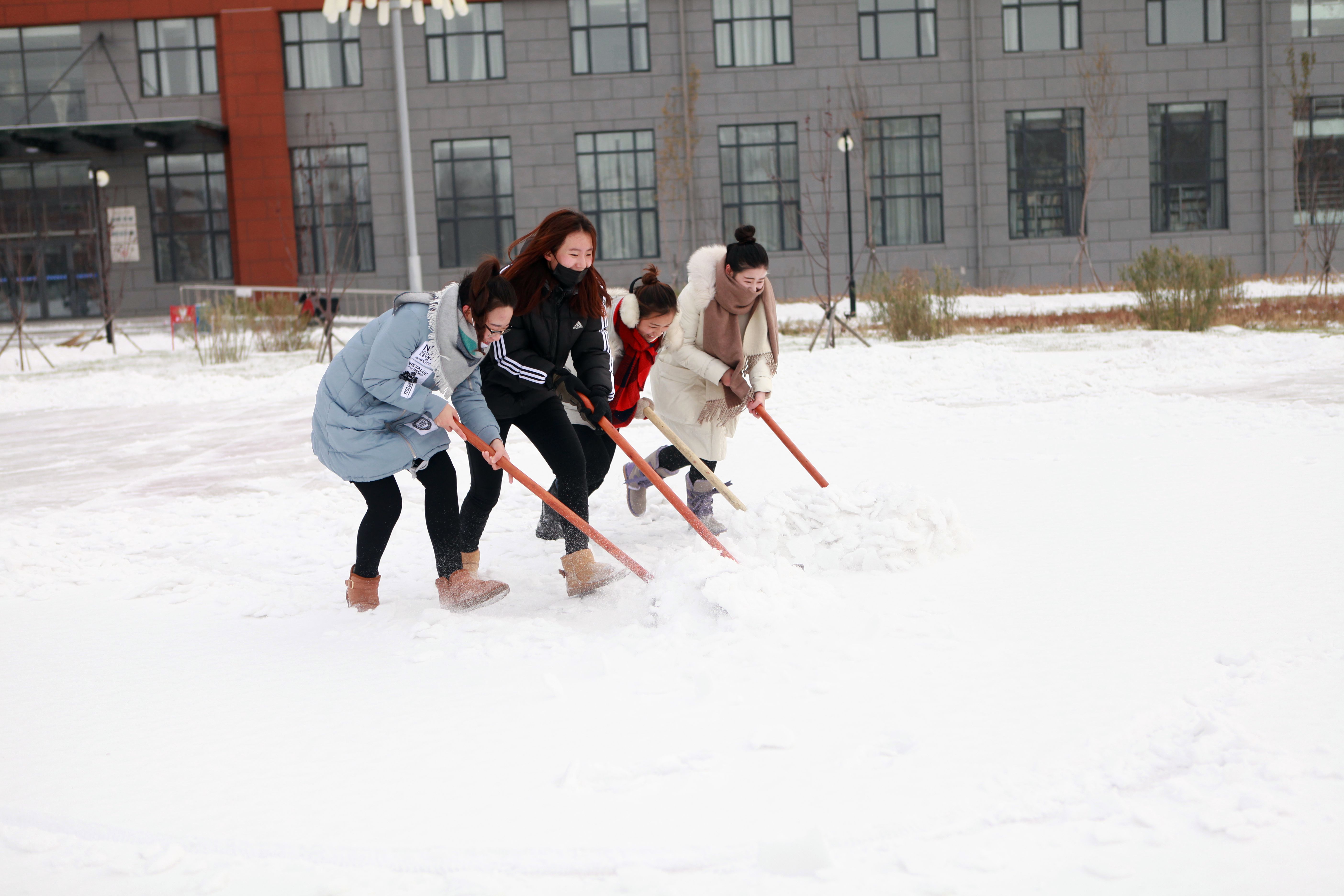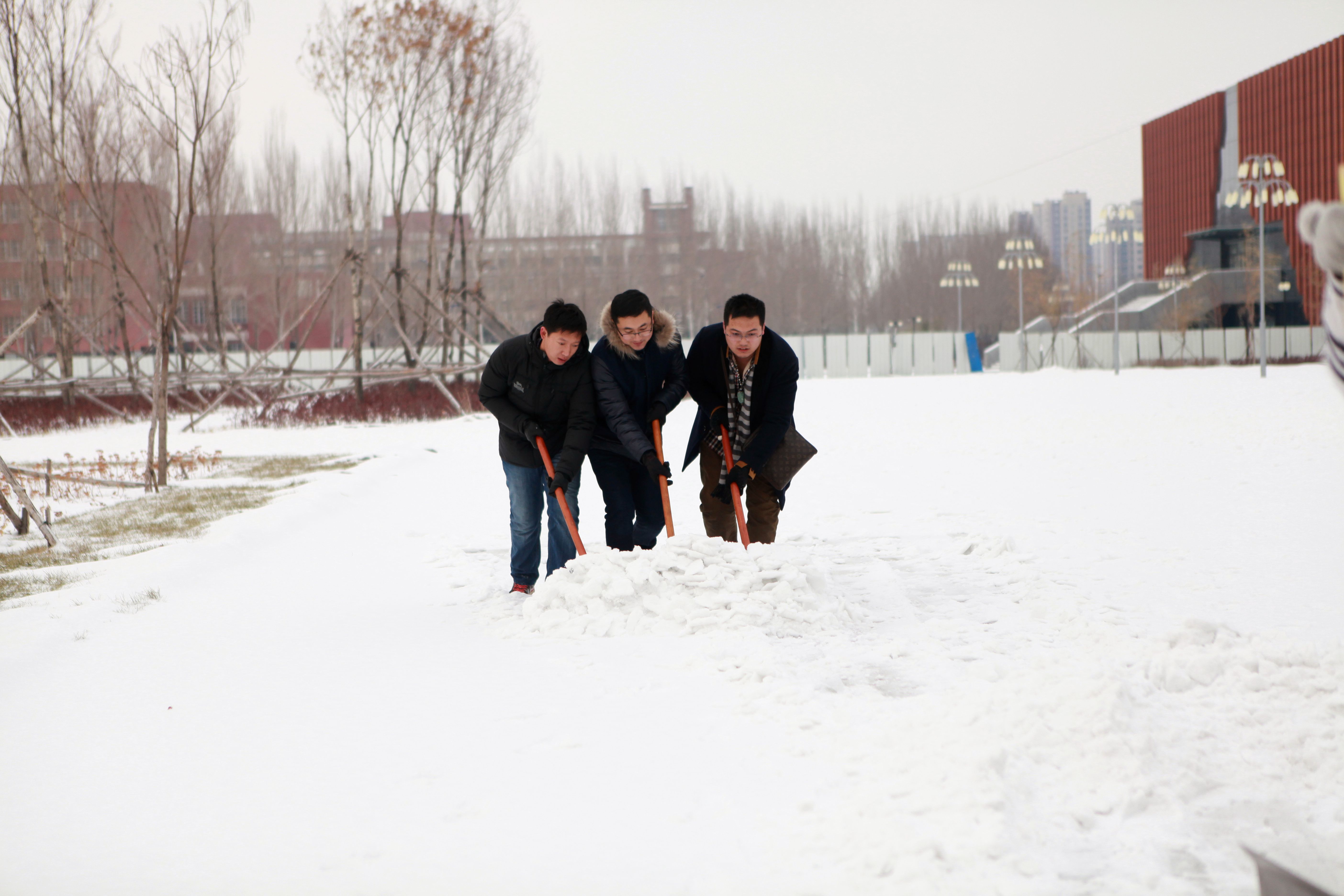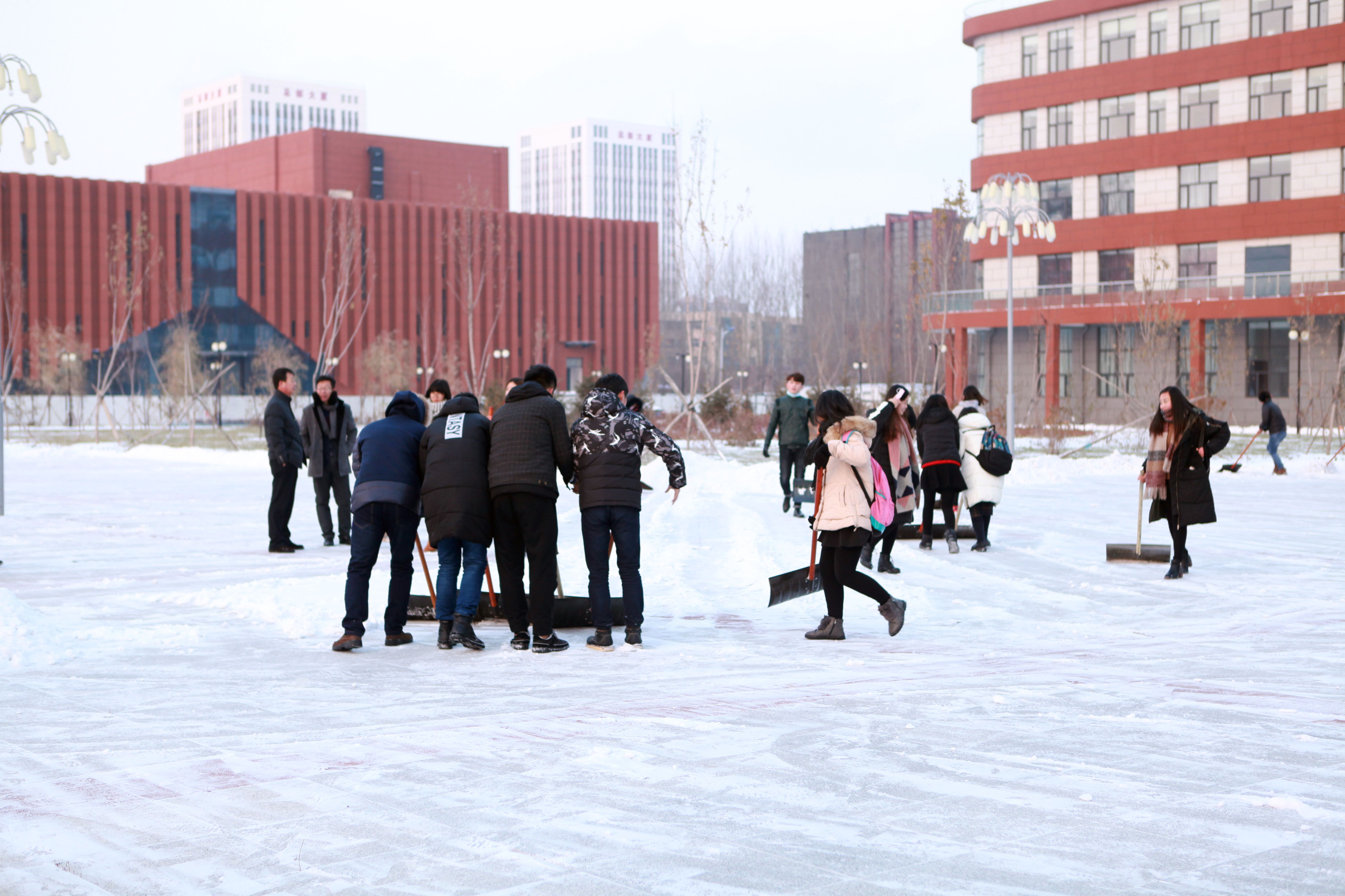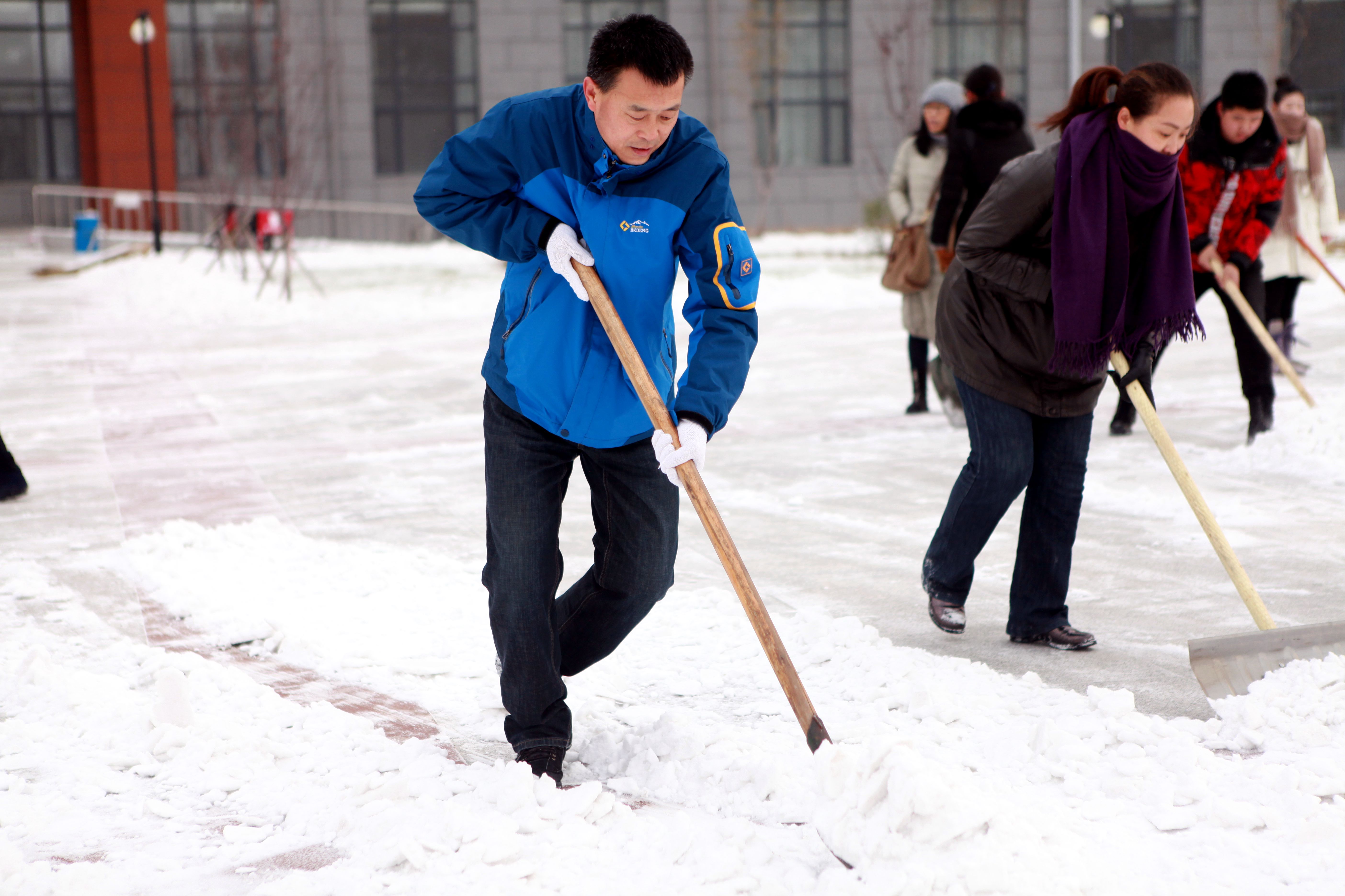为确保全院师生的出行安全,学院第一时间组织领导干部、党员、教职工与员工进行清雪活动,分批对best365中国官方网站男女生寝室楼下以及教学楼前明德广场进行了清扫。冷冽的寒风和零下十几度的低温使扫雪工作异常艰难。“清雪突击队”的成员们手挥铁锹和扫帚,奋力铲雪、扫雪,用除雪板齐力推雪,老师和同学们的脸冻得通红,手指也冻的不灵活,但这一切并没有影响大家为校园服务的热情。