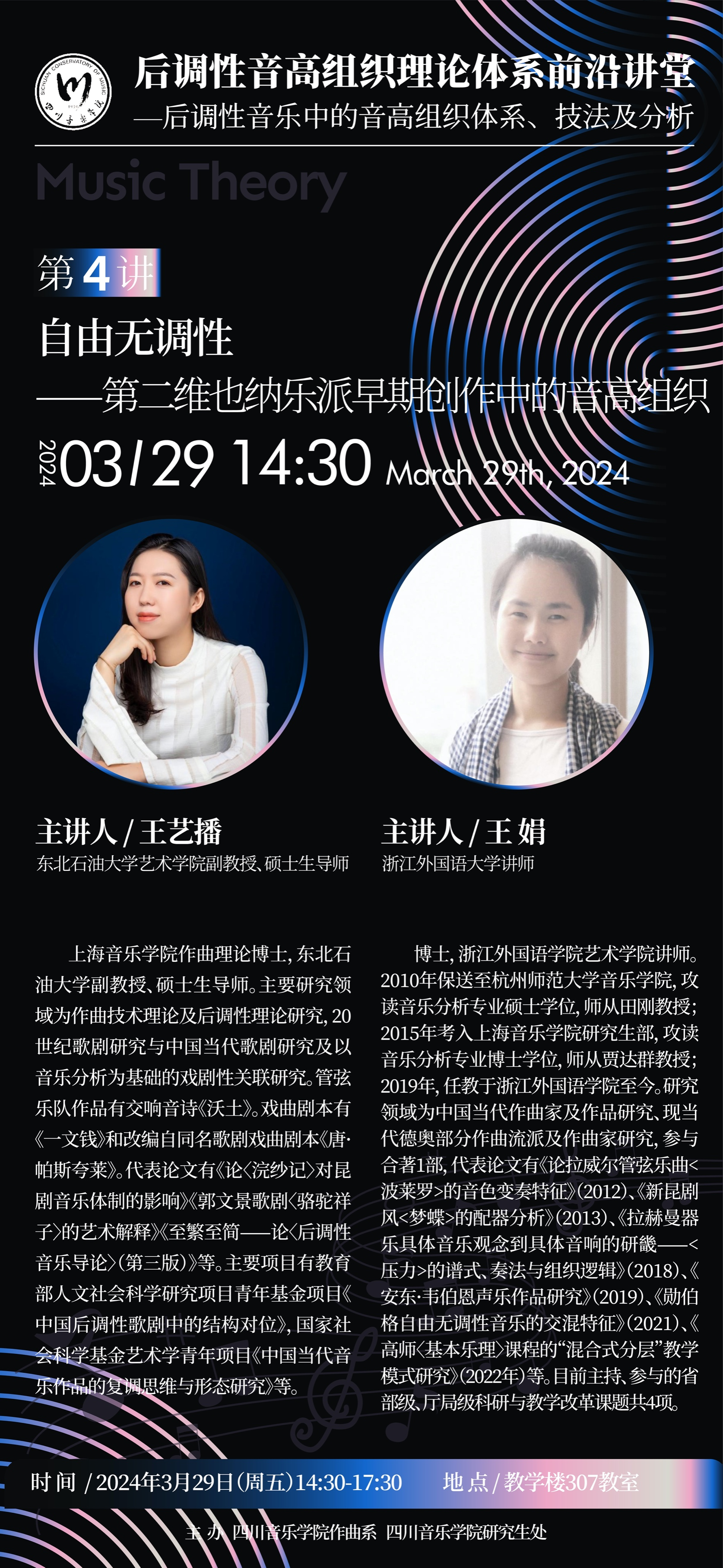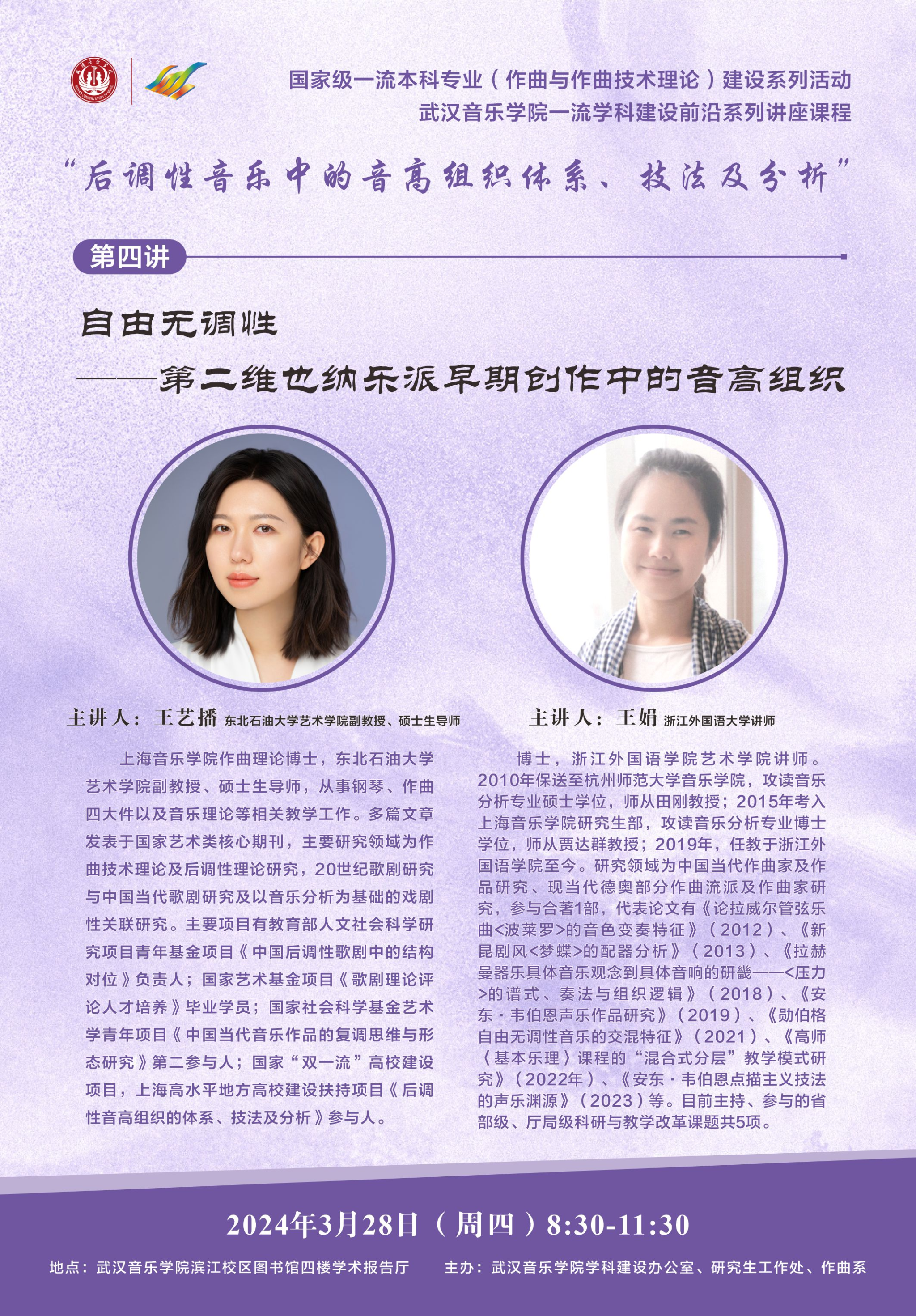 公司best365中国官方网站教师王艺播受邀于武汉音乐学院和四川音乐学院讲学。讲座主要内容“后调性音乐中的音高组织技术、技法及分析系列讲座”的第四讲《自由无调性——第二维也纳乐派早期创作中的音高组织技术》。