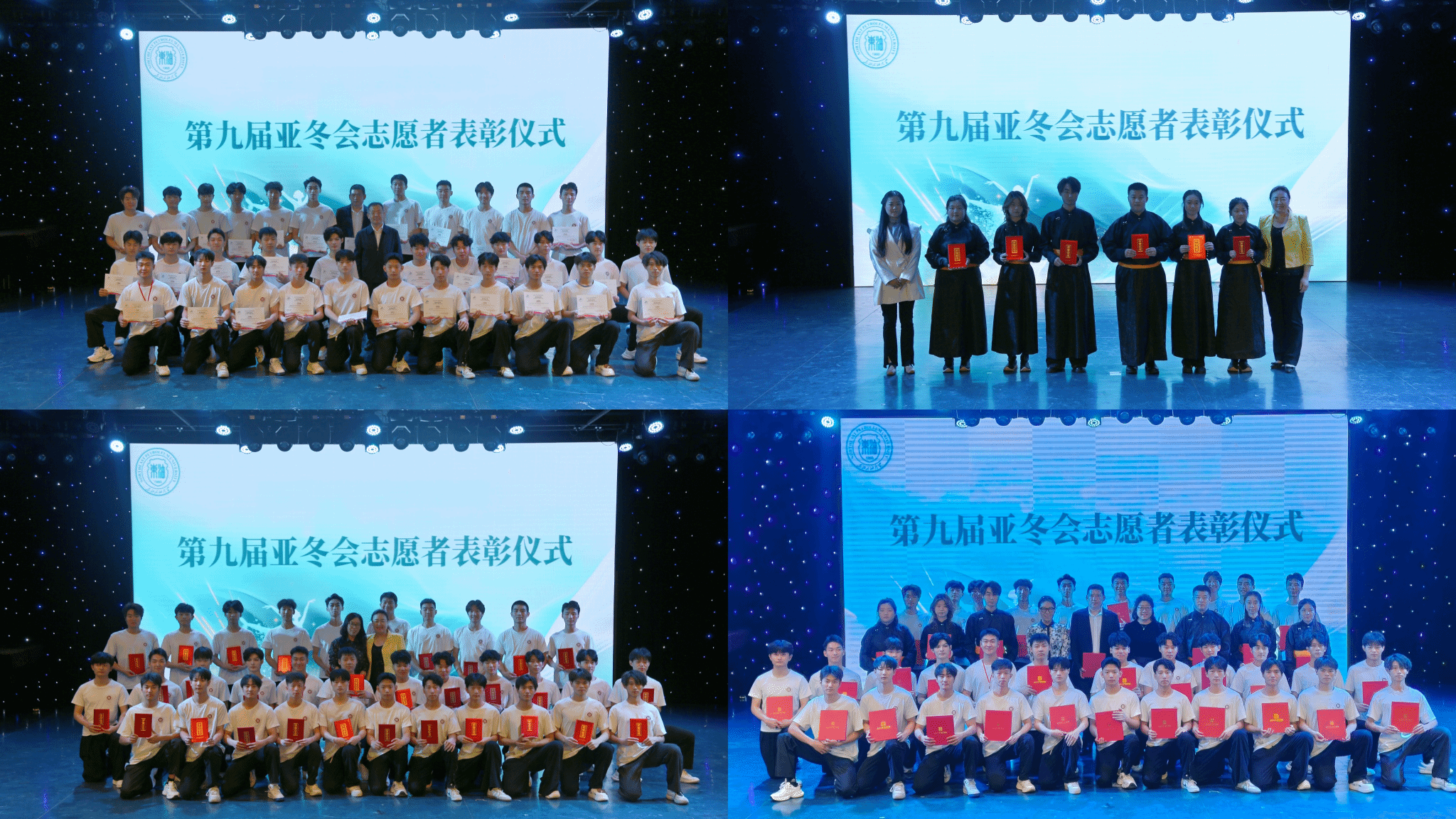 比赛结束后的表彰仪式中,校院两级领导为受邀参加第九届亚冬会开闭幕式表演的同学们颁发了亚冬会纪念证书、校团委志愿者证书、以及学院的礼物。开闭幕式上,舞蹈表演专业的33名同学参演了《长歌颂冰河》《点亮亚洲》等节目。音乐表演专业6名同学参演开幕式暖场节目《龙马弦韵》。同学们用饱满的热情、高超的琴技和奔放的舞姿,向世界展示了中国底蕴深厚的传统文化和富有地域特色的冰雪文化。同学们经历过从晨光熹微到星斗满天,连续奋战19小时重构节目的艰难时刻。700多个小时的排练,在84个日日夜夜里,与时光竞走,同星辰共舞。其敬业精神成为开幕式“雪冷血热”主题的生动诠释。学校为员工们提供了心理与生活的全方位保障。