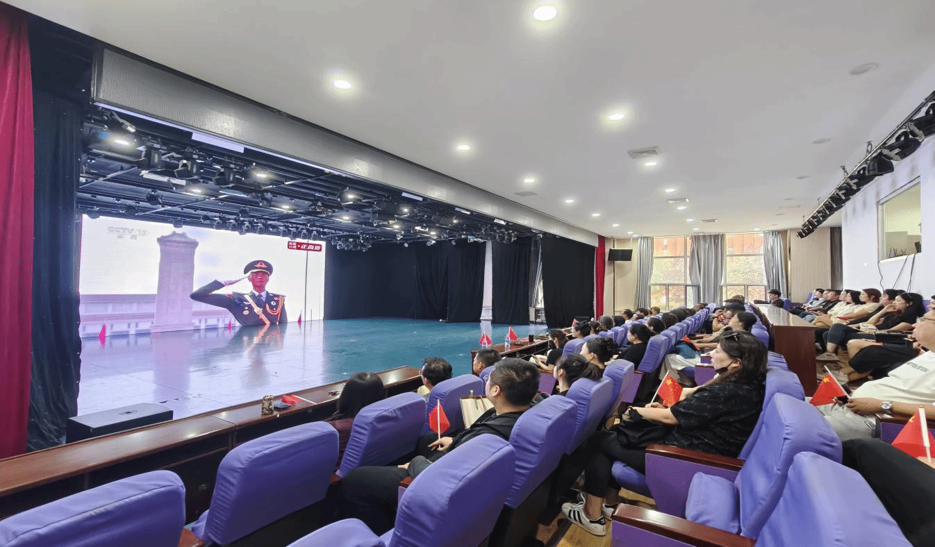 早点8:30,全体教职工和员工便满怀期待地提前来到会场,等待仪式开始。当大屏幕中传来激昂雄壮的国歌声时,在场师生全体起立,齐唱国歌,沉浸在那庄严而骄傲的氛围中。整个观看过程,全体师生都全神贯注,目光紧随镜头移动,不时还发出一声声赞叹,为祖国的强大和繁荣感到无比自豪。