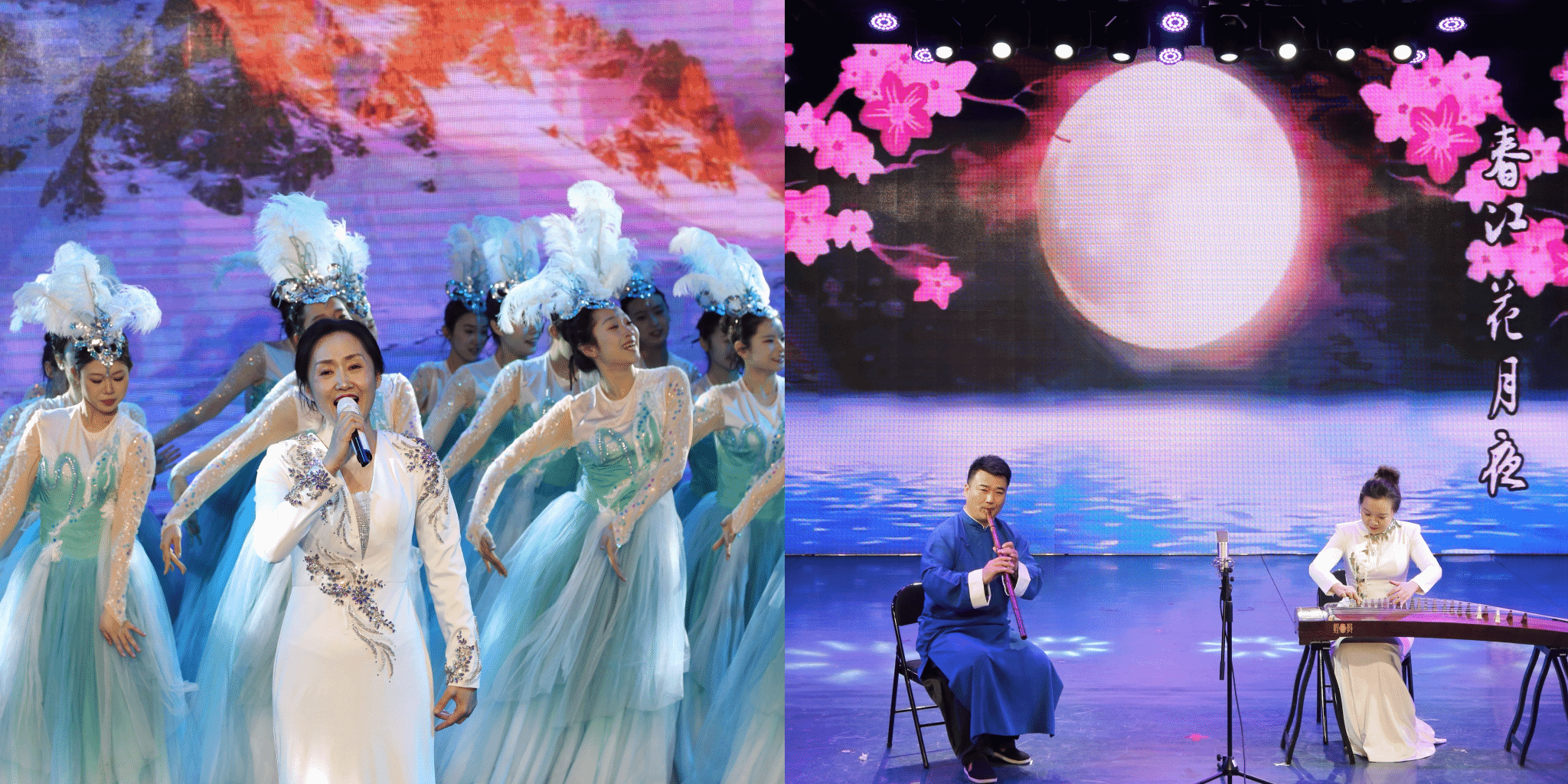 女高音独唱《我爱你塞北的雪》表达对祖国大地的赤诚热爱;洞箫与古筝合奏《春江花月夜》彰显传统民乐的典雅醇厚。